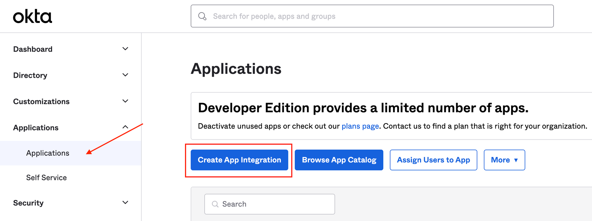 In the sidebar menu, navigate to Applications → Applications and click the Create App Integration button.