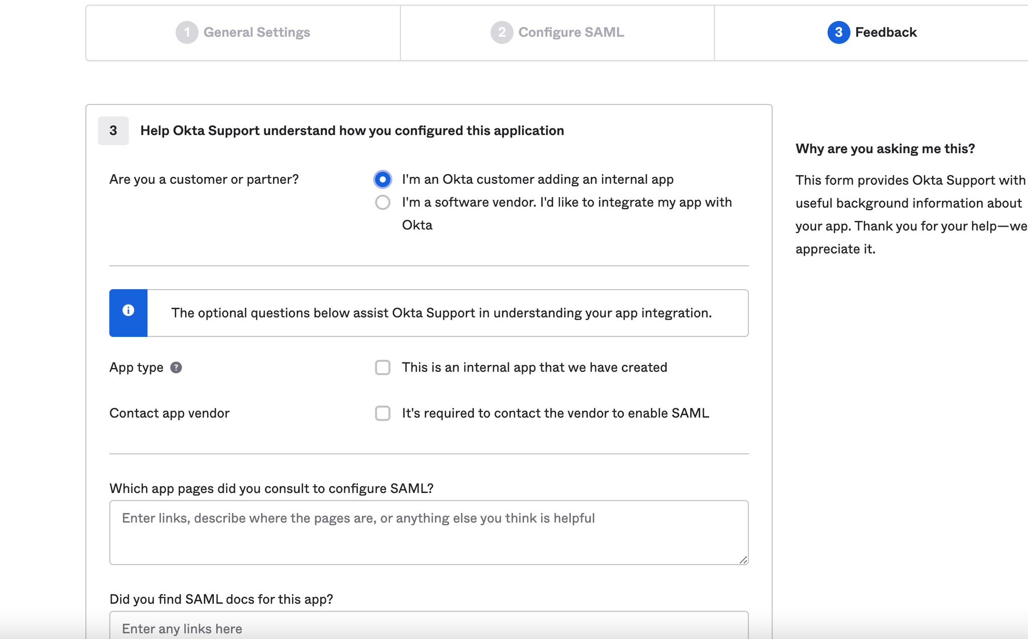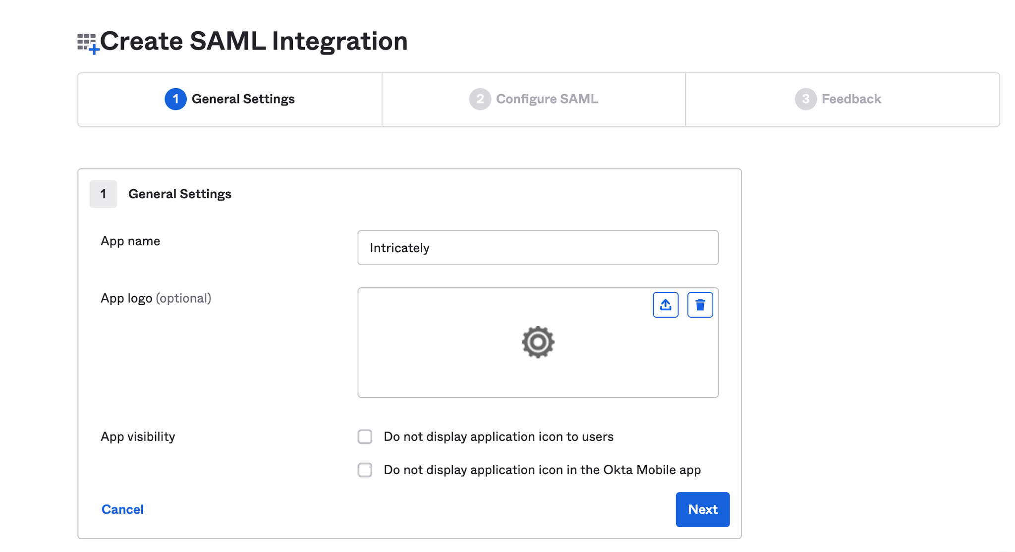 You'll be redirected to a form with 3 steps: General Settings, Configure SAML and Feedback. First, fill in the name you want to give to your App Integration and hit Next.