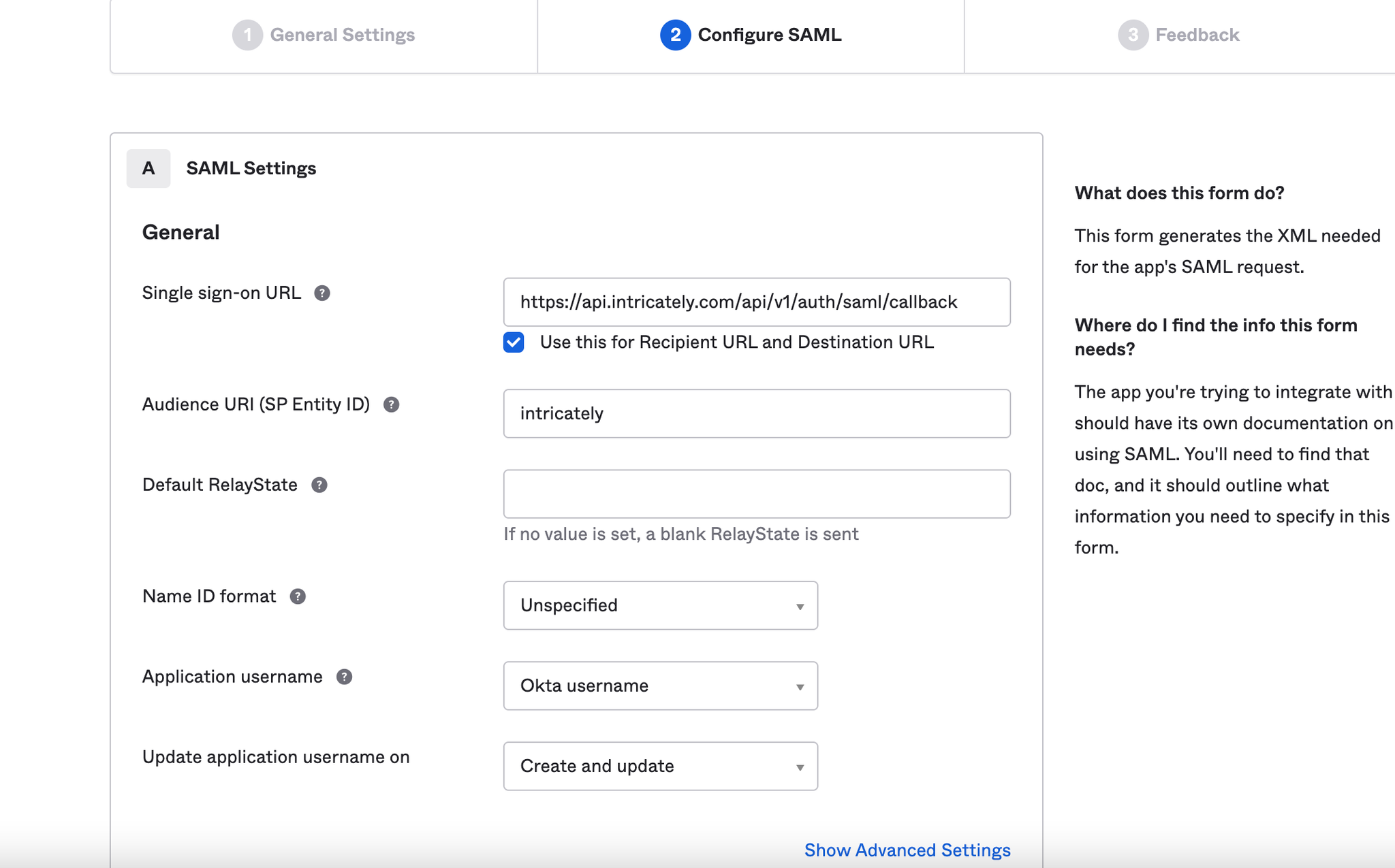 Now you will add the Single Sign-On URL and Audience URI you have copied from Intricately's page.