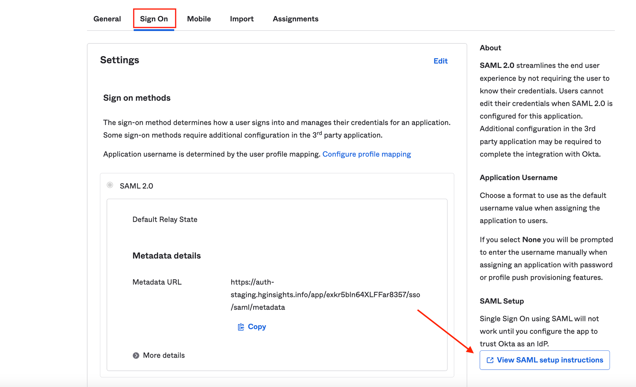 Still within your Okta dashboard, go to your App Integration page and find the Sign On tab.