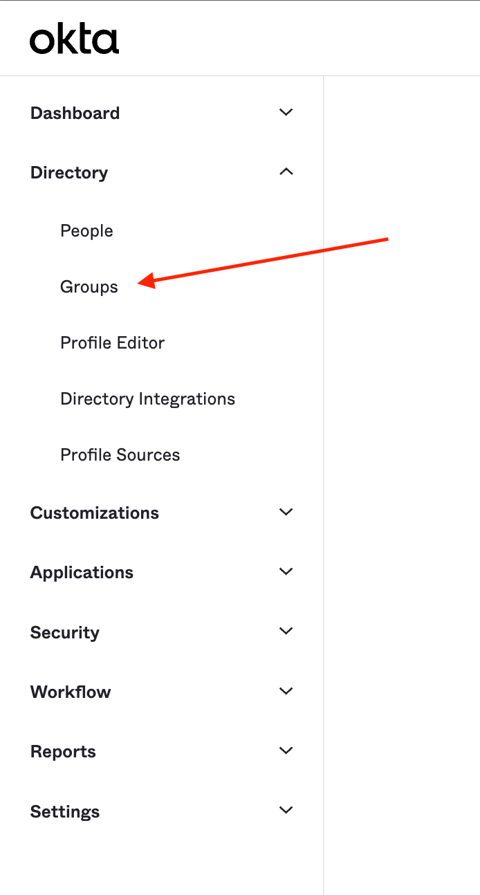 In your Okta dashboard, find the section Directory → Groups, where you can create a group or add an existing group to your integration.