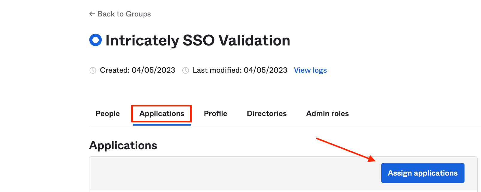 Click in the group you want to give access and find the tab Applications and click Assign applications, assigning the App Integration you have just created for Intricately.